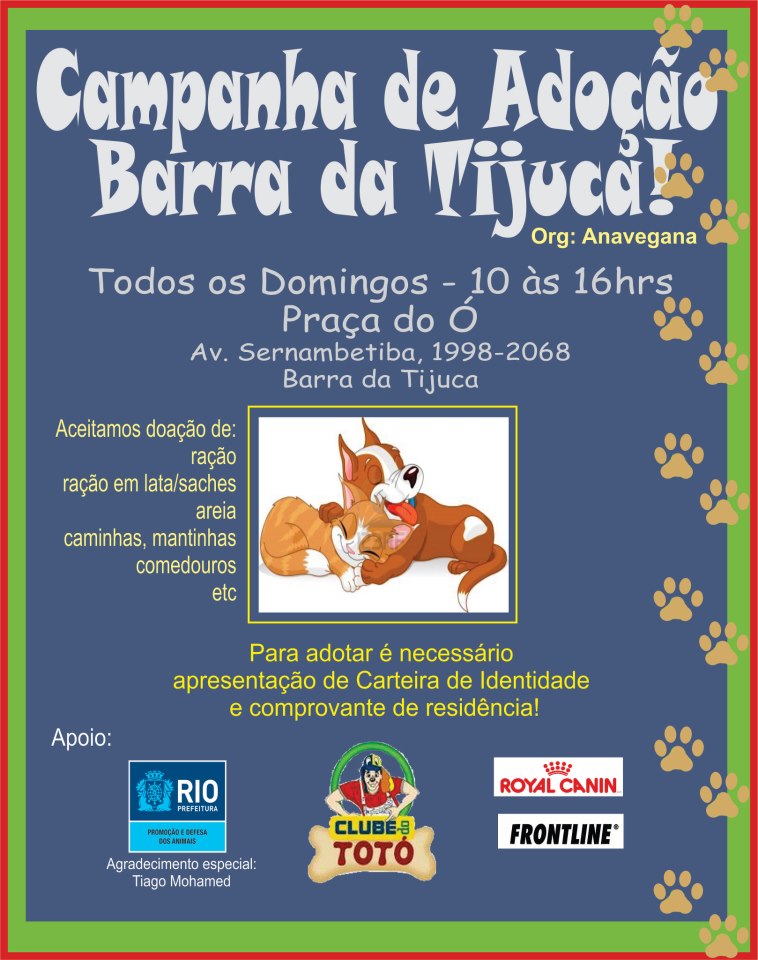 O mais novo Point de Adoção do Rio de Janeiro agora todos os domingos na Barra da Tijuca de 9hs as 16hs - Praça do Ó, em frente a churrascaria Tourão, tenda vermelha da Royal Canin